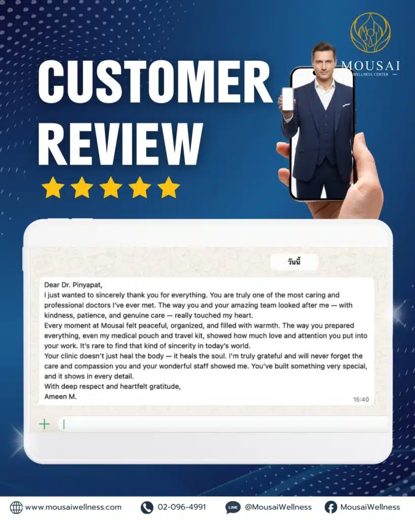 A Heartfelt Review from One of Our Valued Clients At Mousai Wellness Center, we believe true healing goes beyond the physical body — it embraces the mind, emotions, and the entire client experience. We are deeply grateful for the trust you place in our medical team. Your kind words inspire us to continue providing sincere care, advanced expertise, and a truly holistic wellness journey every single day. Thank you for choosing Mousai. Your health is our purpose — and your trust means the world to us. Looking for expert consultation? Book your appointment today! Mousai Wellness Center Location: https://maps.app.goo.gl/5upfoxwpdsg9hVNx5 Line: @MousaiWellness mousaiwellness.com 02-0964991, 061-8941881
