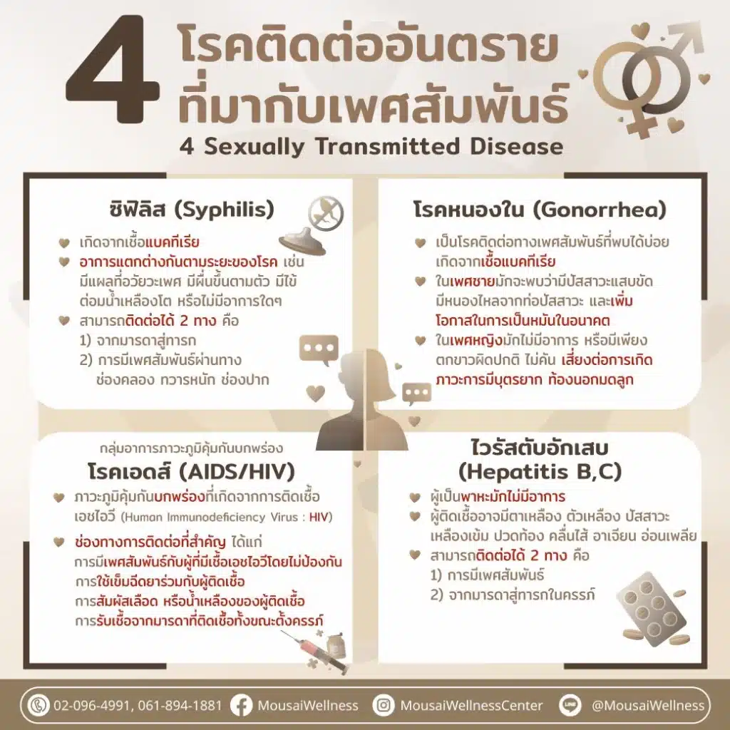 🚨 4 โรคติดต่ออันตราย ที่มากับเพศสัมพันธ์! 🚨By Mousai Wellness / กรกฎาคม 22, 2024 ซิฟิลิส (𝑺𝒚𝒑𝒉𝒊𝒍𝒊𝒔) เกิดจากเชื้อแบคทีเรียอาการแตกต่างกันตามระยะของโรค เช่น มีแผลที่อวัยวะเพศ มีผื่นขึ้นตามตัว มีไข้ ต่อมน้ำเหลืองโต หรือไม่มีอาการใดๆ ติดต่อได้ 2 ทาง คือ 1. จากมารดาสู่ทารก2. การมีเพศสัมพันธ์ผ่านทาง ช่องคลอง ทวารหนัก ช่องปาก โรคหนองใน (𝑮𝒐𝒏𝒐𝒓𝒓𝒉𝒆𝒂) เป็นโรคติดต่อทางเพศสัมพันธ์ที่พบได้บ่อย เกิดจากเชื้อแบคทีเรียในเพศชายมักจะพบว่ามีปัสสาวะแสบขัด มีหนองไหลจากท่อปัสสาวะ และเพิ่มโอกาสในการเป็นหมันในอนาคตในเพศหญิงมักไม่มีอาการ หรือมีเพียง ตกขาวผิดปกติ ไม่คัน เสี่ยงต่อการเกิด ภาวะการมีบุตรยาก ท้องนอกมดลูก โรคเอดส์ (𝑨𝑰𝑫𝑺/𝑯𝑰𝑽) ภาวะภูมิคุ้มกันบกพร่องที่เกิดจากการติดเชื้อ เอชไอวี (Human Immunodeficiency Virus : HIV) ช่องทางการติดต่อที่สำคัญ ได้แก่ – การมีเพศสัมพันธ์กับผู้ที่มีเชื้อเอชไอวีโดยไม่ป้องกัน– การใช้เข็มฉีดยาร่วมกับผู้ติดเชื้อ– การสัมผัสเลือด หรือน้ำเหลืองของผู้ติดเชื้อ– การรับเชื้อจากมารดาที่ติดเชื้อทั้งขณะตั้งครรภ์ ไวรัสตับอักเสบ (𝑯𝒆𝒑𝒂𝒕𝒊𝒕𝒊𝒔 𝑩,𝑪) ผู้เป็นพาหะมักไม่มีอาการผู้ติดเชื้ออาจมีตาเหลือง ตัวเหลือง ปัสสาวะเหลืองเข้ม ปวดท้อง คลื่นไส้ อาเจียน อ่อนเพลีย สามารถ ติดต่อได้ 2 ทาง คือ1) การมีเพศสัมพันธ์2) จากมารดาสู่ทารกในครรภ์ สำหรับการป้องกันความเสี่ยงโรคติดต่อได้ง่าย ๆ ได้แก่ ✅ ใช้ถุงยางอนามัยทุกครั้ง✅ ตรวจคัดกรองโรคติดต่อทางเพศสัมพันธ์เป็นประจำ✅ รักษาความสะอาด หลีกเลี่ยงการสัมผัสเลือด หรือสารคัดหลั่ง สอบถามข้อมูลการตรวจคัดกรองโรคติดต่อได้ที่ศูนย์ดูแลสุขภาพ 🏥 Mousai Wellness Center 🌿 ( ใกล้ BTS พร้อมพงษ์ : สุขุมวิท 39 ).📍 https://maps.app.goo.gl/5upfoxwpdsg9hVNx5📩 Line : @MousaiWellness🌐 mousaiwellness.com☎️ 02-0964991 , 061-8941881 #Mousai #MousaiWellness #Wellness #Holistic #Checkup #BasicCheckup #ดูแลสุขภาพ #ศูนย์สุขภาพ #ความงาม #ชะลอวัย #ตรวจคัดกรองโรคติดต่อ #ตรวจเลือด #ตรวจโรคติดต่อ #ตรวจก่อนรู้ก่อน #ตรวจก่อนรู้ก่อนป้องกันได้ Related posts:Celebrating International Women's Day with Strength, Health, and LongevityLooking for a protein that does more than just build muscle?Honokiol: The Natural Key to Relieving Stress, Enhancing Health, and Boosting Vitality!